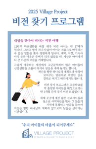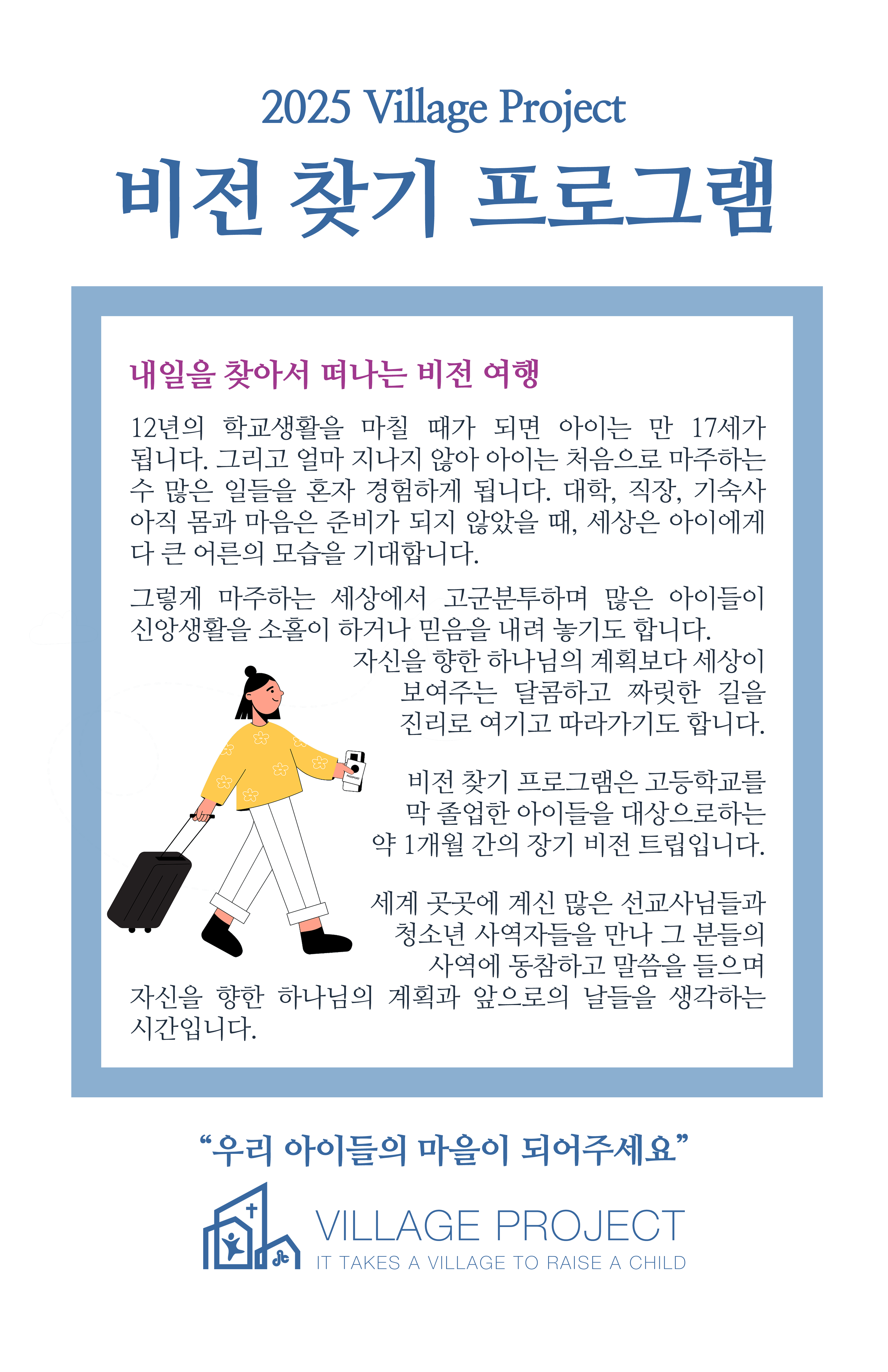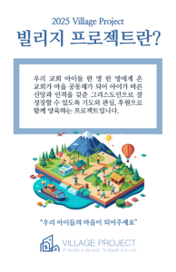 ‘빌리지 프로젝트‘는 뉴저지동산교회 교회학교 아이들을 위한 후원 프로그램으로, “한 아이를 키우려면 온 마을이 필요하다(It takes a village to raise a child)”는 철학을 바탕으로 합니다. 목표는 교회 공동체가 하나의 마을이 되어, 아이들이 신앙과 사회적 책임감을 갖춘 성인으로 성장할 수 있도록 돕는 것입니다.